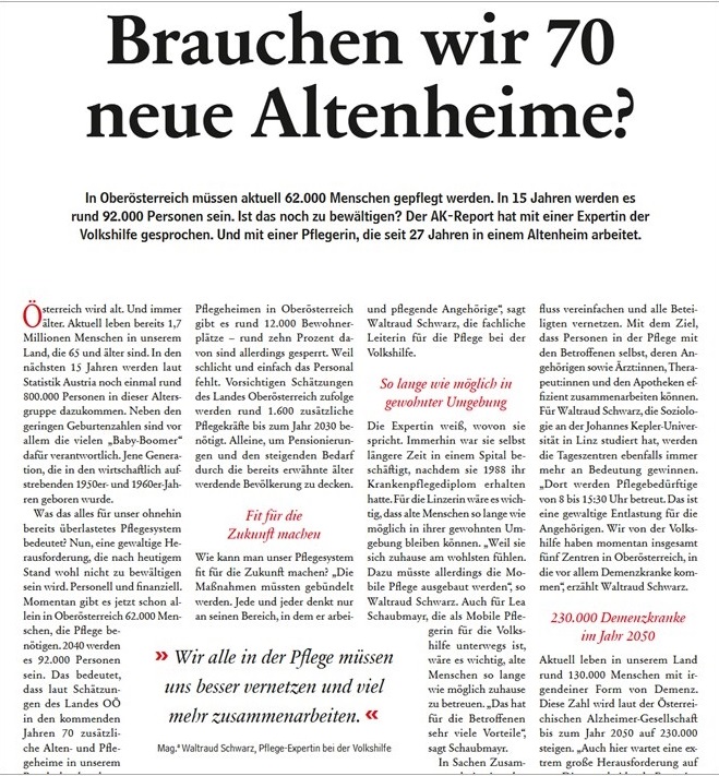In der aktuellen Ausgabe des AK Reports OÖ vom April 2025 spricht Waltraud Schwarz von der Volkshilfe Oberösterreich über die Notwendigkeit von Vernetzung und Zusammenarbeit in der Pflege und verweist dabei auf das Projekt Linked Care, welches sich eben dieser Thematik widmet. Der Beitrag ist auf den Seiten 4-6 zu finden. Download und Link zum Artikel